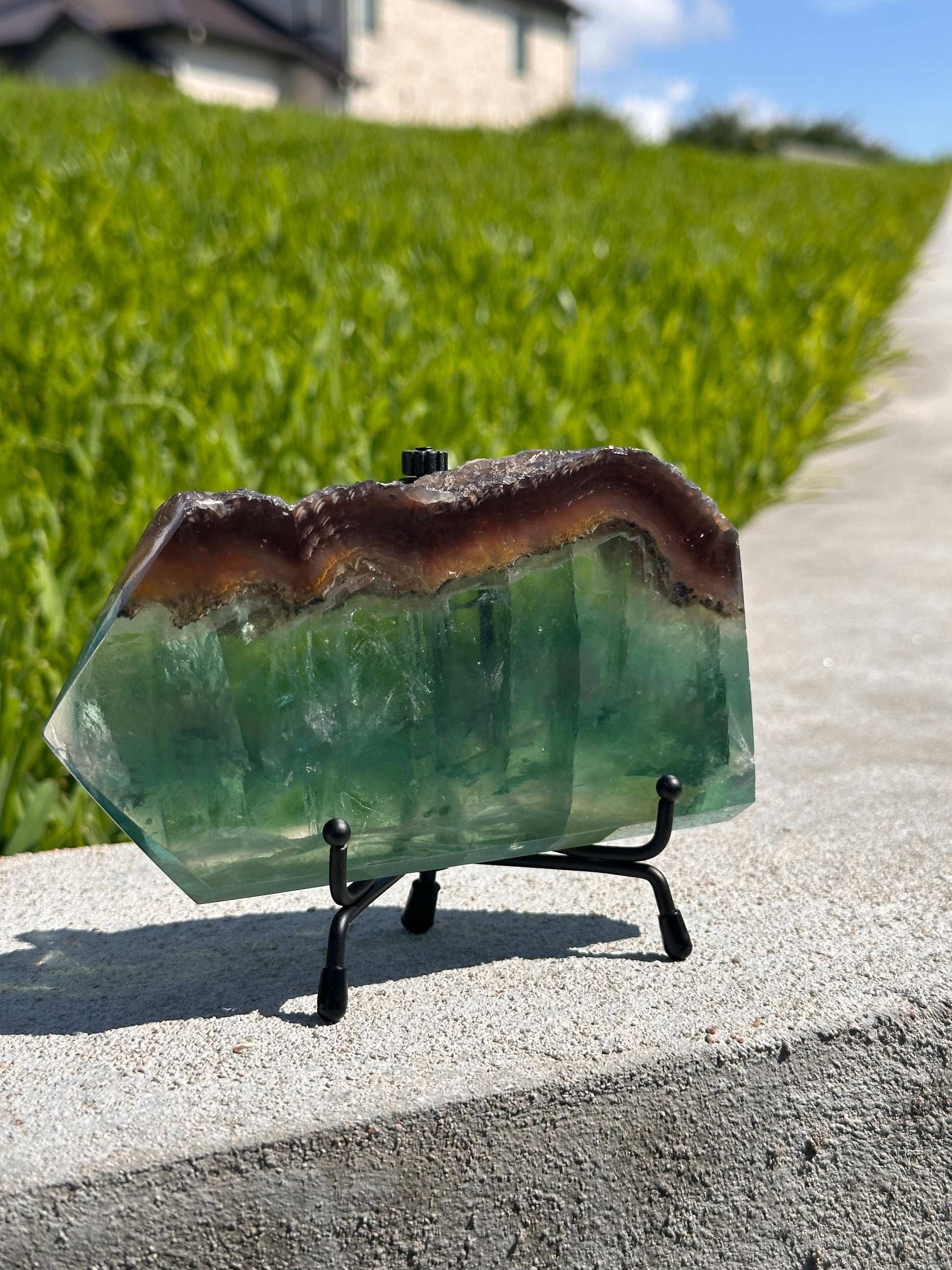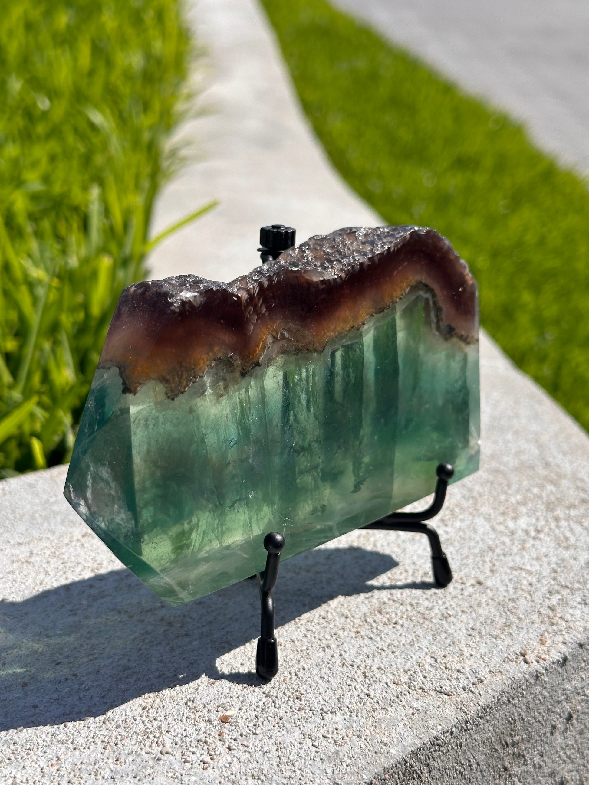 Flourite is often used to promote concentration, so this beautiful slice would be stunning in your office or study area. Green flourite in particular is associated with the heart chakra and will help you with emotional healing and releasing trauma. This Crystal features a trim of yellow and purple flourite as well making it truly one of a kind!