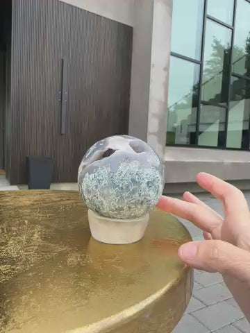 This stunning statement sphere is a lovely combination of moss agate, blue chalcedony, and some breathtaking druzy caves! The stabilizing energies of moss agate and the harmonizing energies of chalcedony creates a very positive dynamic. These properties will help you with your heart and throat chakras, allowing you to open your eyes to the resources around you, communicate with nature, and find peace. Recharge yourself by staking at all that sparkle that lies within this stone! Working with this stone helps you find the sparkle within yourself as well!