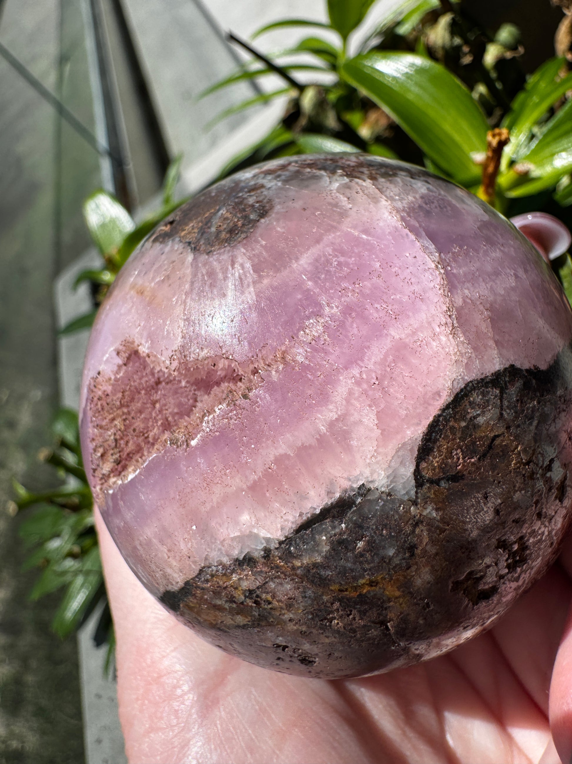 Pink Aragonite with Druzy Cave & Magnetite Sphere 383 Grams