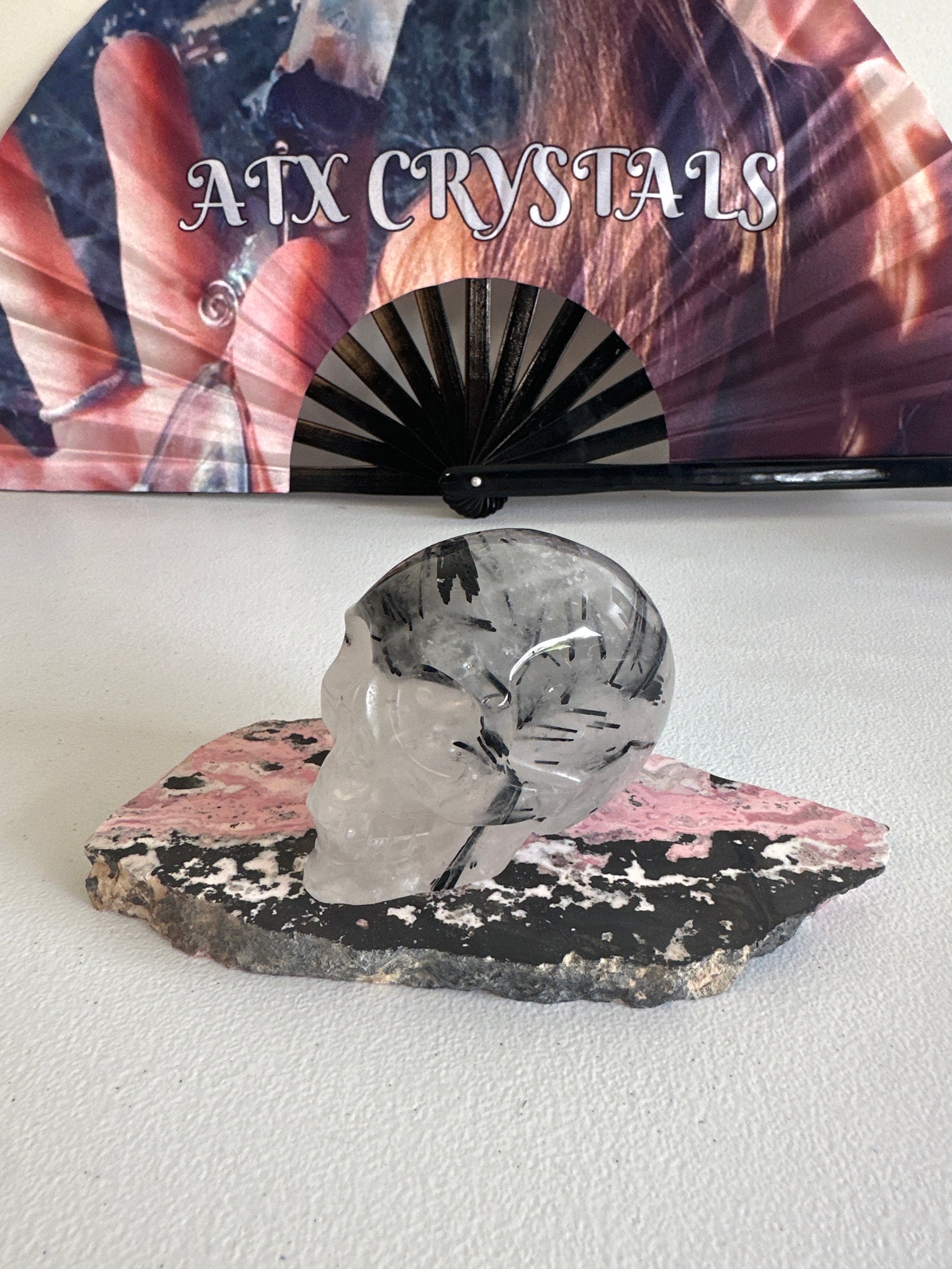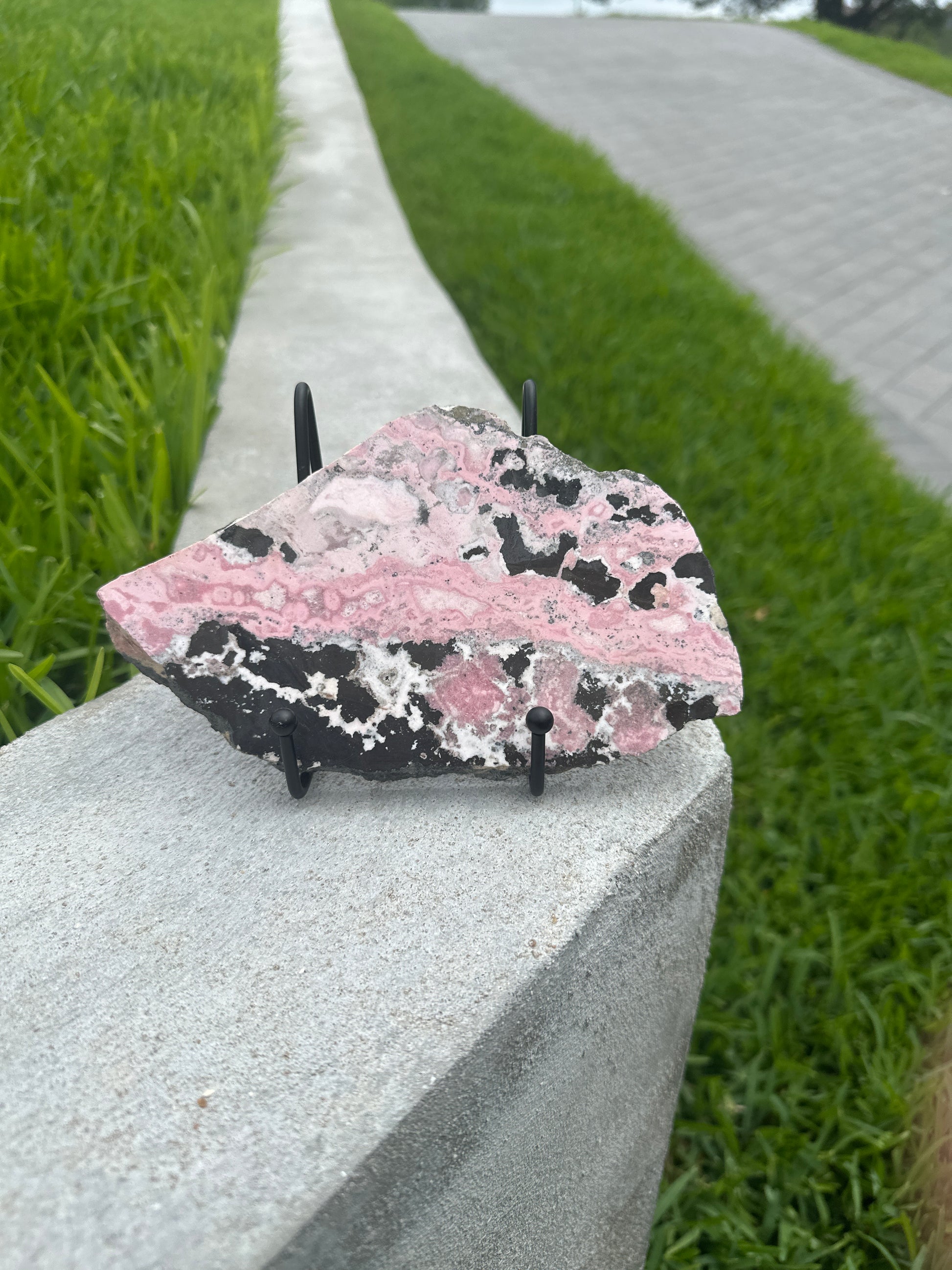 This rhodonite slab is a beautiful array of multiple shades of pinks black and white. It looks beautiful on its own or stacked with something like the tourmaline skull as shown (skull sold separately).