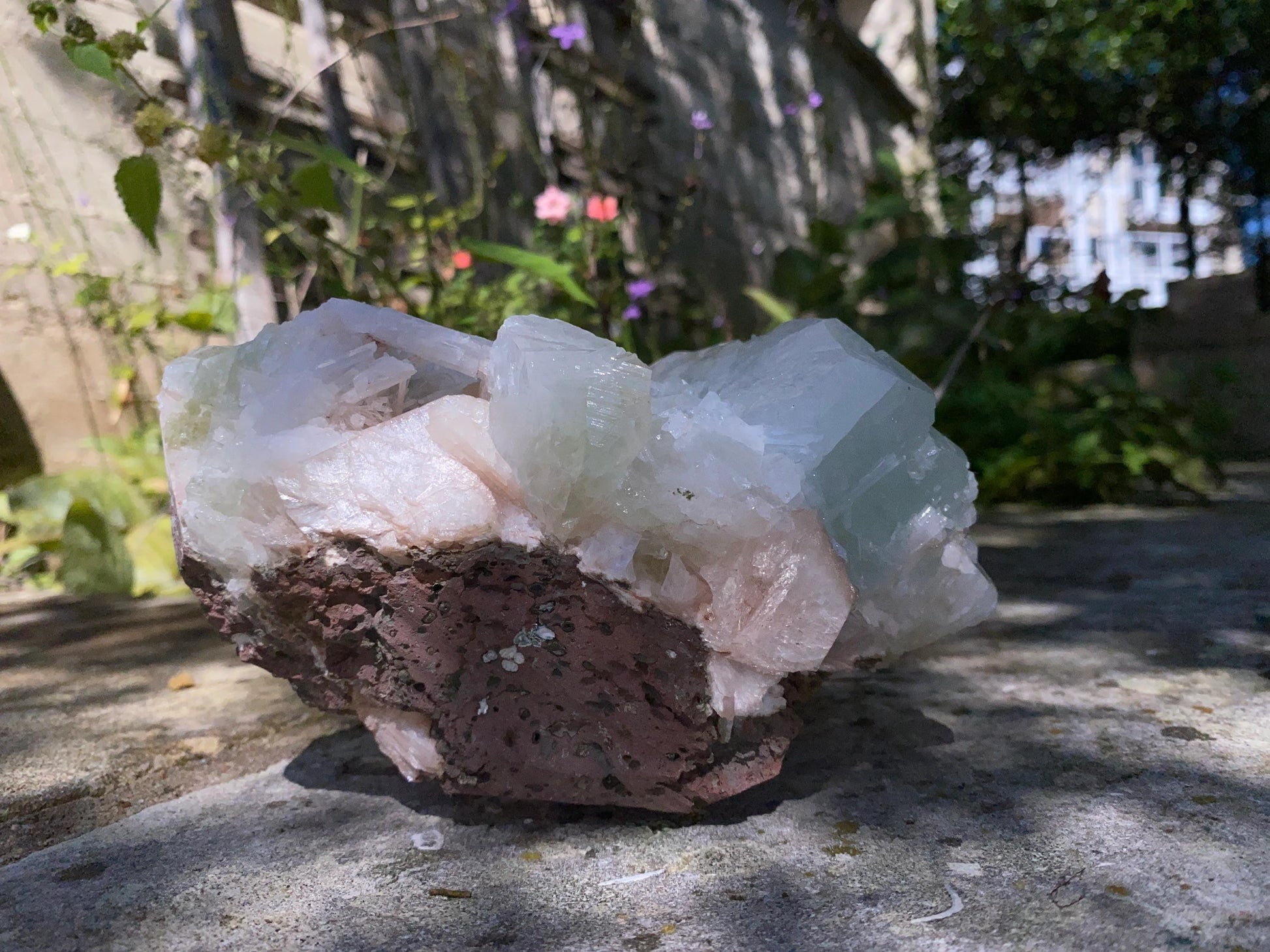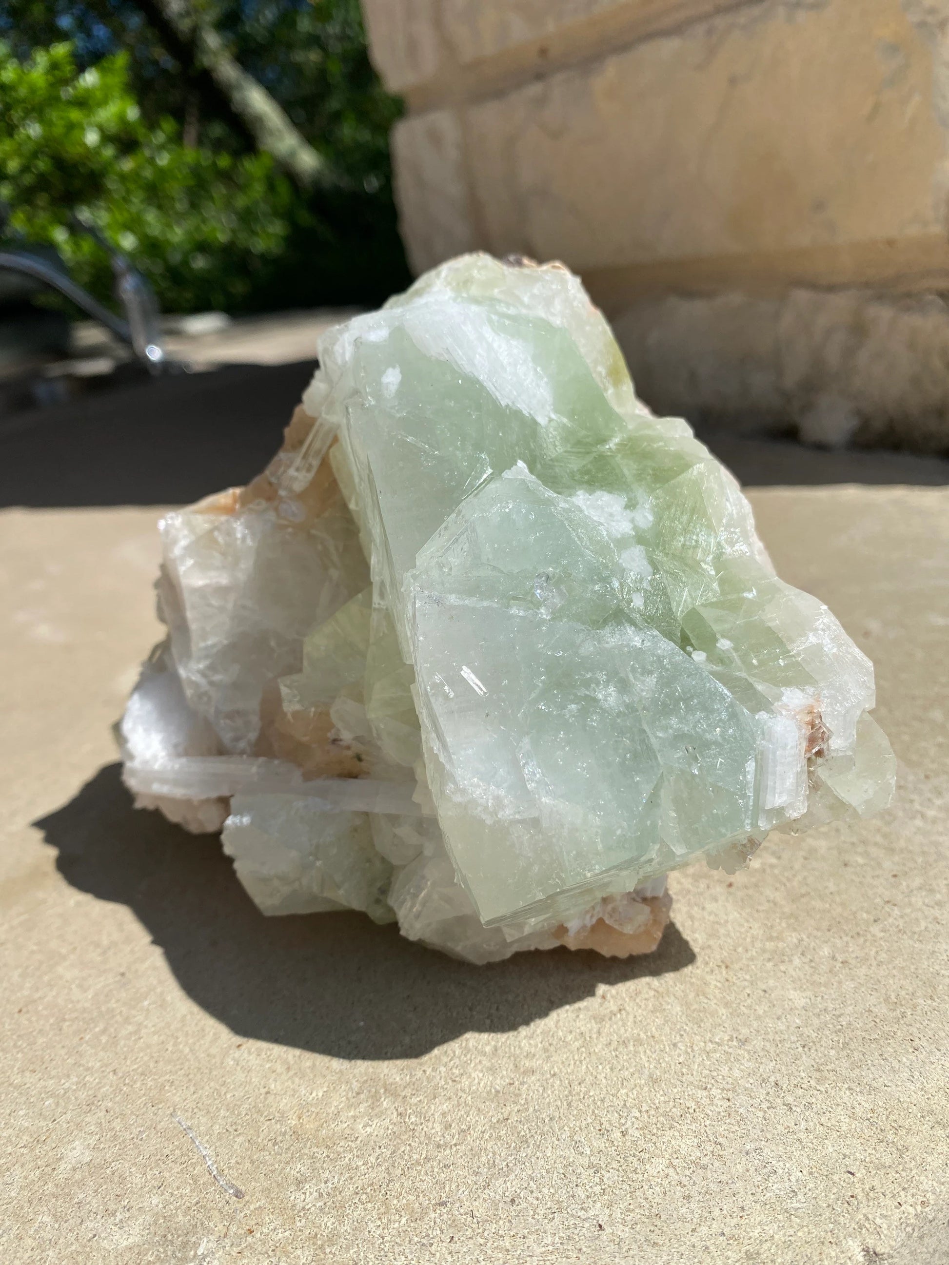 Tap into angelic realms with this extra large gorgeous green apophyllite with needles of Scolecite and Stilbite. This gorgeous beauty comes from India and weighs 4 lbs. she has been cleaned in a pink Himalayan sea salt bath and charged in the sun. The energy is so beautiful and high vibrational!