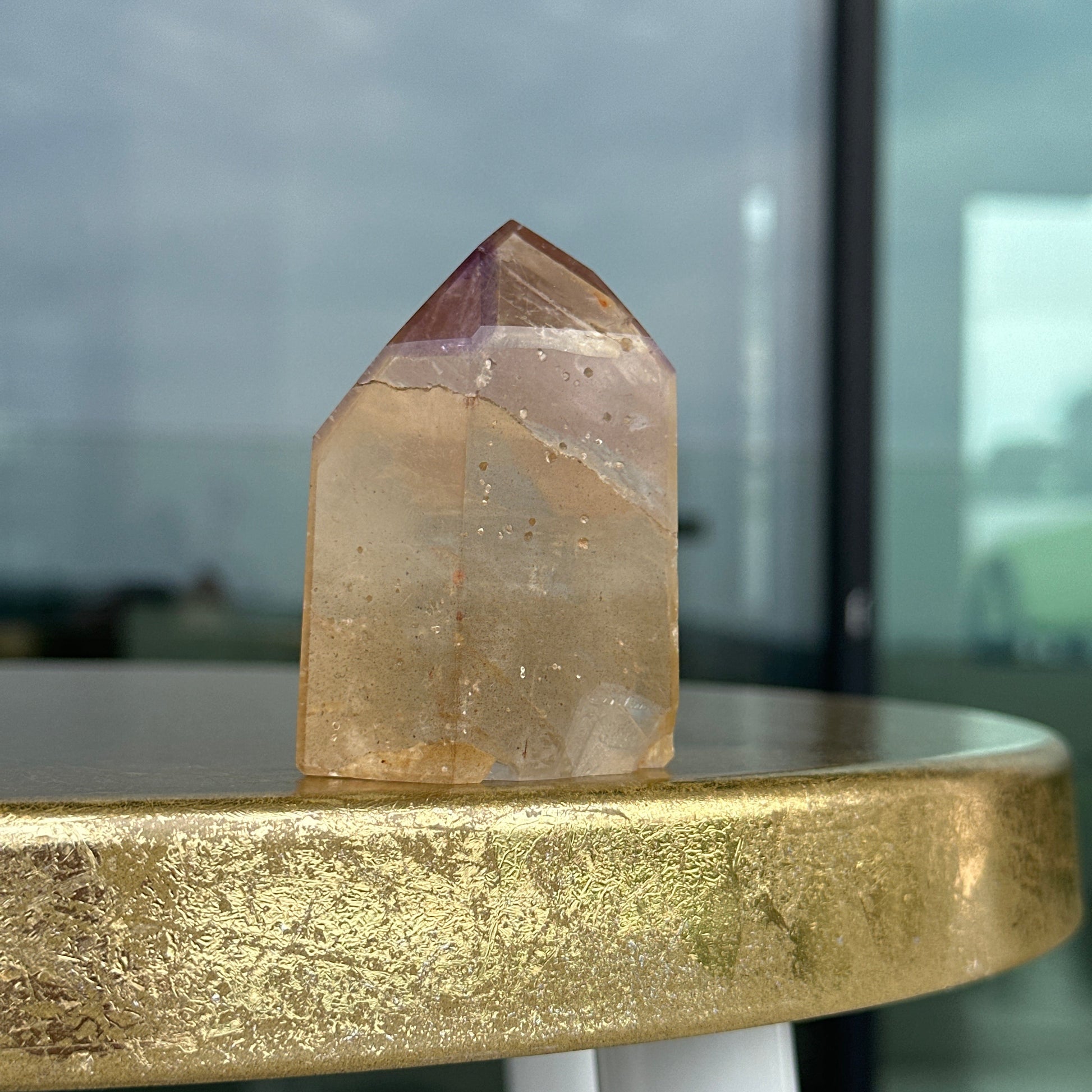 Dreamcoat lemurian crystals, much less one this large, are difficult to find, making this a super special crystal. This crystal possesses the magical energy of a Lemurian Quartz that has been "dreamcoated" with a phantom inclusion at the tip during its natural growth process. That dreamcoat layer includes Amethyst, Smoky Quartz, Rutile, Goethite and Cocaxenite. Dreamcoat lemurians are typically found in Brazil, and are believed to be a high vibration quartz that holds the ancient encoded knowledge from the civilization of Lemuria. During meditation, you may want to use this crystal to help you access the ladder to the Akashic Record and to assist in past life recall.